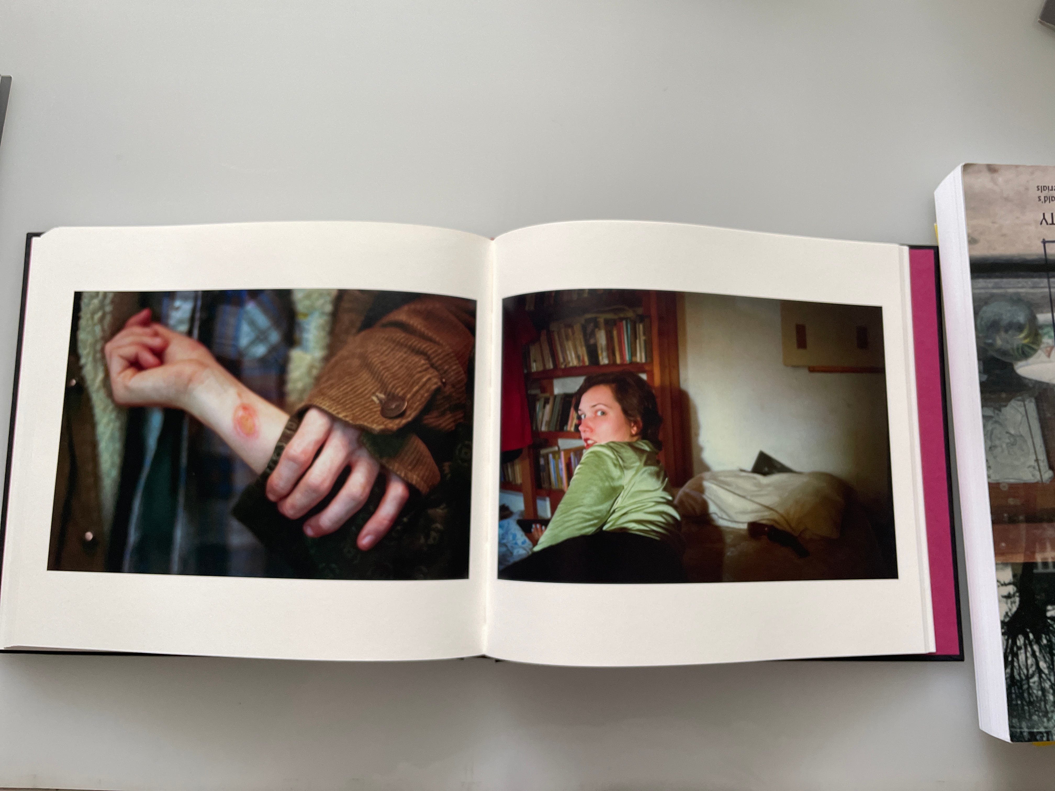 A woman wearing a green velvet top leaned over in bed looks over her shoulder towards the camera. Her crystalline velvet green shirt radiates light in the image, but hidden in shadow lies a handgun next to her pillow. The majority of photographs here are charming slice of life scenes, but this image and neighbor are haunting. They depict two sides of violence. On the right we contemplate how the weapon may be used, and on the left one hand holds another arm to examine scalded skin. It goes to show that even the most joyful recollections must face harsh realities.